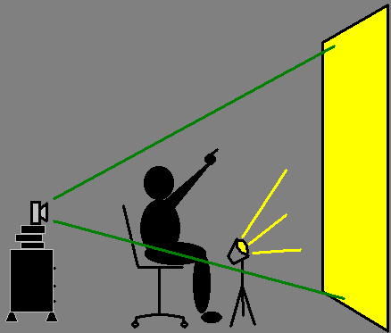 The camera is positioned on top of a stack of books on top of a small cabinet behind the actor who is giving the classic "I'm pointing at something" pose. The green lines indicate the camera's field of view. Notice that the light is in the camera's field of view, but since it is hidden by the chair, there's no problem.