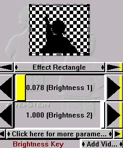 At this point, the SV bar should be selected and located above the EV bar. Click on the "Add Video Effect" button. (You can't miss it.) A menu will appear. Select "Key Effects > Brightness Key". The upper, right-hand quadrant (URQ) will show your EV. That's because right now, the effect settings are at default. Notice the checkerboard pattern that just appeared? That's what's being keyed-out of the SV. Move the "Brightness 1" slider over a little and more of the SV will start to come through.