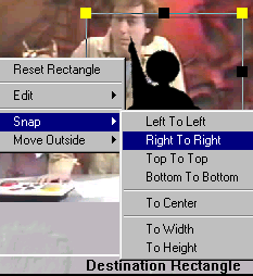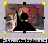 So, now you have an effective shadowrama effect. But, you're silhouettes are huge. Worse than that, they're in the way! The solution is to move them over and make them smaller. To make the silhouettes smaller, you'll need to resize the "Destination Rectangle". The DR is where the selected video source ends up in the final video. You can't miss it. It's in the URQ. To resize the DR, use the yellow squares on the corners of the image you see in the URQ. (DO NOT use the black squares!) Pick one of the yellow squares and resize the DR to make the silhouettes however big you think they should be.